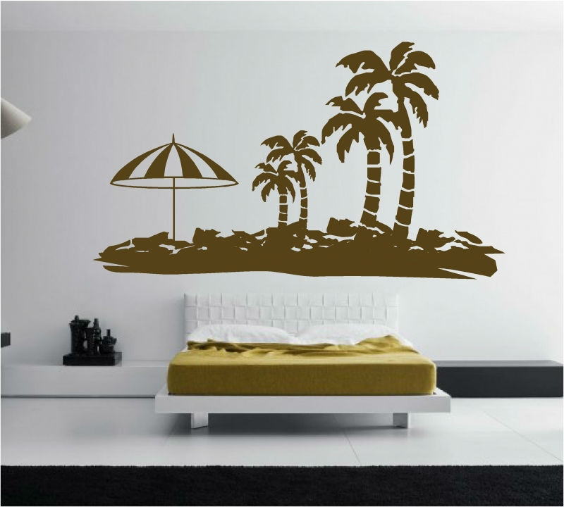 Sticker decorativ palmieri pe plaja. Aplica-l pe un perete intr-o camera spatioasa si te vei avea impresia ca esti pe o plaja insorita. Face parte din categoria stickere perete copaci exotici