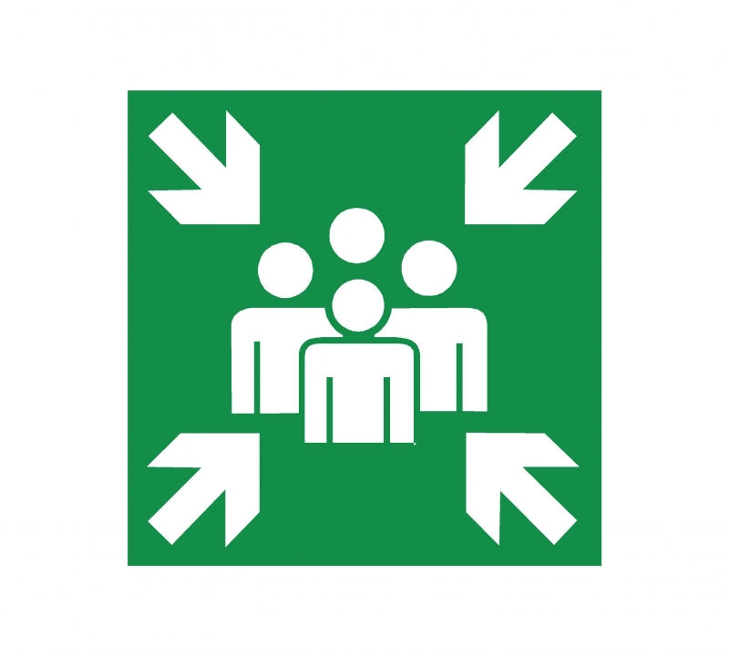 Sticker decorativ loc de adunare in caz de urgenta . FStickerul este livrat lipit pe o placa pvc ( forex ) de 2 mm grosime care se poate lipi cu banda dublu adeziva pe perete sau orice suprafata plana